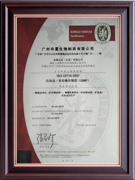 公司始創(chuàng)建于2012年,經(jīng)過(guò)八年的健康發(fā)展,已經(jīng)成為可以從事妝字號(hào)、消字號(hào)、械字號(hào)等系列產(chǎn)品生產(chǎn)加工的大型企業(yè)。企業(yè)坐落在美麗的廣州白云區(qū)鐘樓潭鎮(zhèn),擁有面積超過(guò)15,000平方米的生產(chǎn)廠(chǎng)房。廠(chǎng)房寬敞明亮,設(shè)計(jì)科學(xué)新進(jìn),擁有十萬(wàn)級(jí)的生產(chǎn)車(chē)間,局部環(huán)境可以達(dá)到一萬(wàn)級(jí)別;設(shè)備多采用新進(jìn)的進(jìn)口設(shè)備,自動(dòng)化程度非常高,擁有一流的生產(chǎn)設(shè)施。工廠(chǎng)同時(shí)通過(guò)了ISO22716和GMCP質(zhì)量管理認(rèn)證,擁有一流的質(zhì)量管理體系。廠(chǎng)